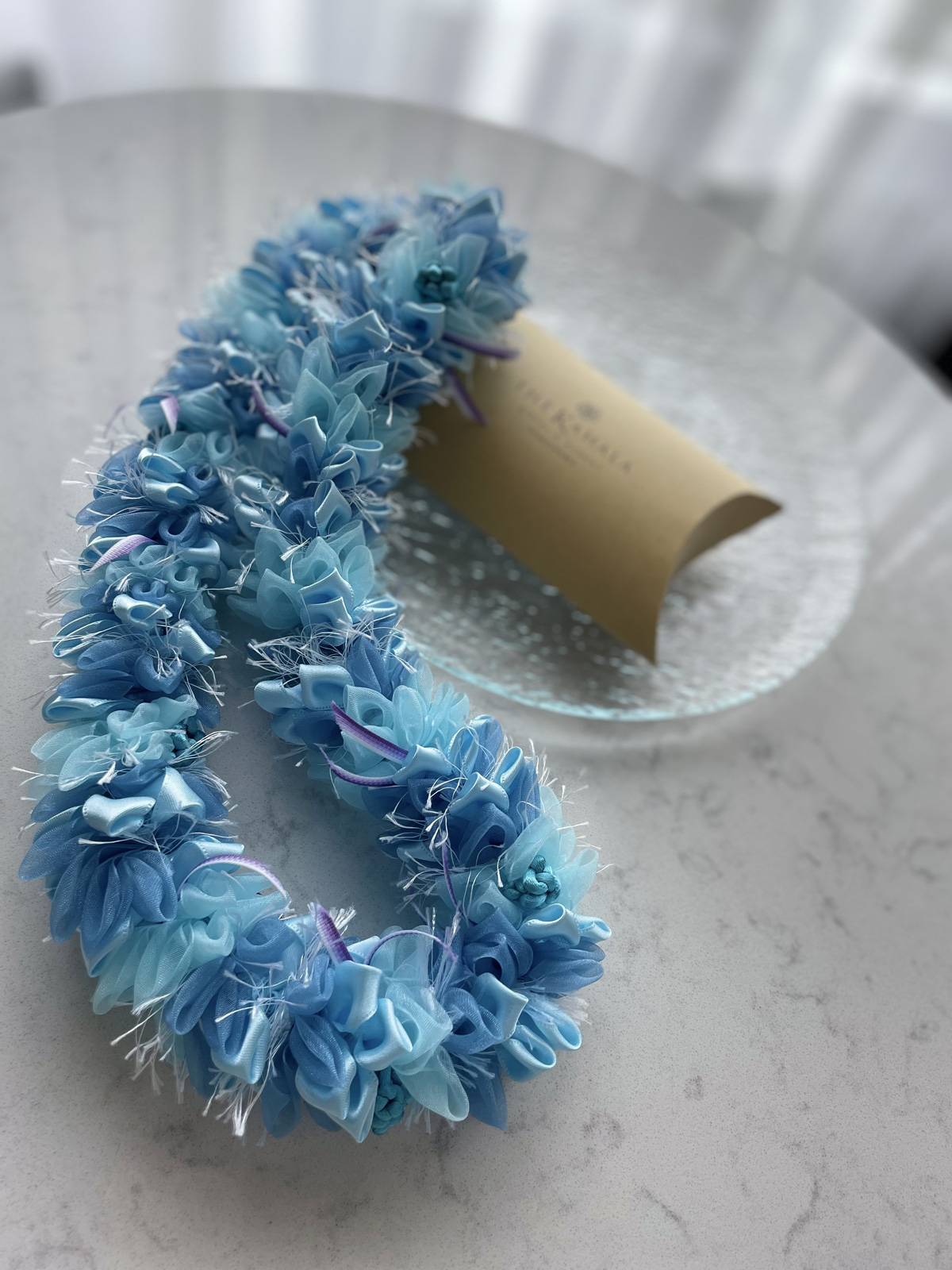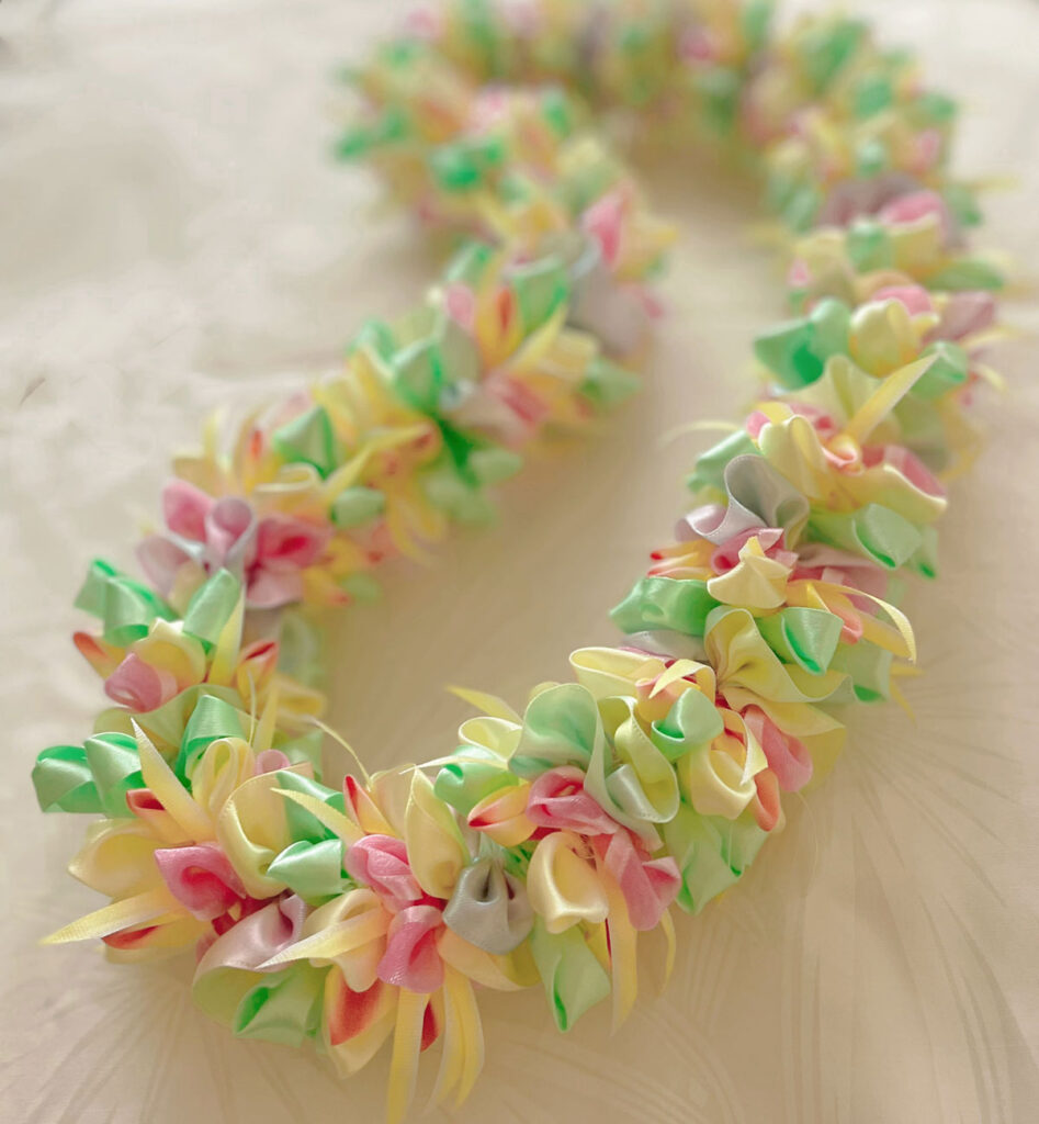 とても入手困難な素敵な輸入リボンをふんだんに使用した豪華で爽やかなレイに仕上がりました。